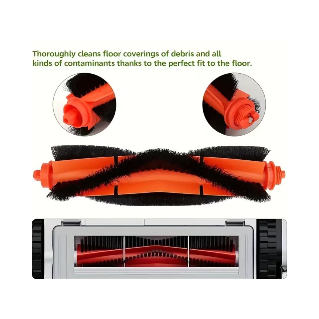 – فرشاة جانبية عالية الجودة: تعمل بكفاءة لتنظيف الزوايا والحواف، موجهة الأوساخ نحو الفرشاة الرئيسية.